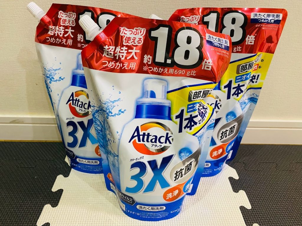 きなた家はドラム式洗濯機を使っているので、洗濯洗剤は液体のものを使用しています。アタックなので汚れもよく落ちておすすめです。