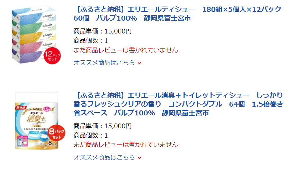 ほかの自治体でもティッシュとトイレットペーパーがあって、量が多くてお得なのもあるのですが、いろいろ購入したところ品質的にこの2つが一番良いです。